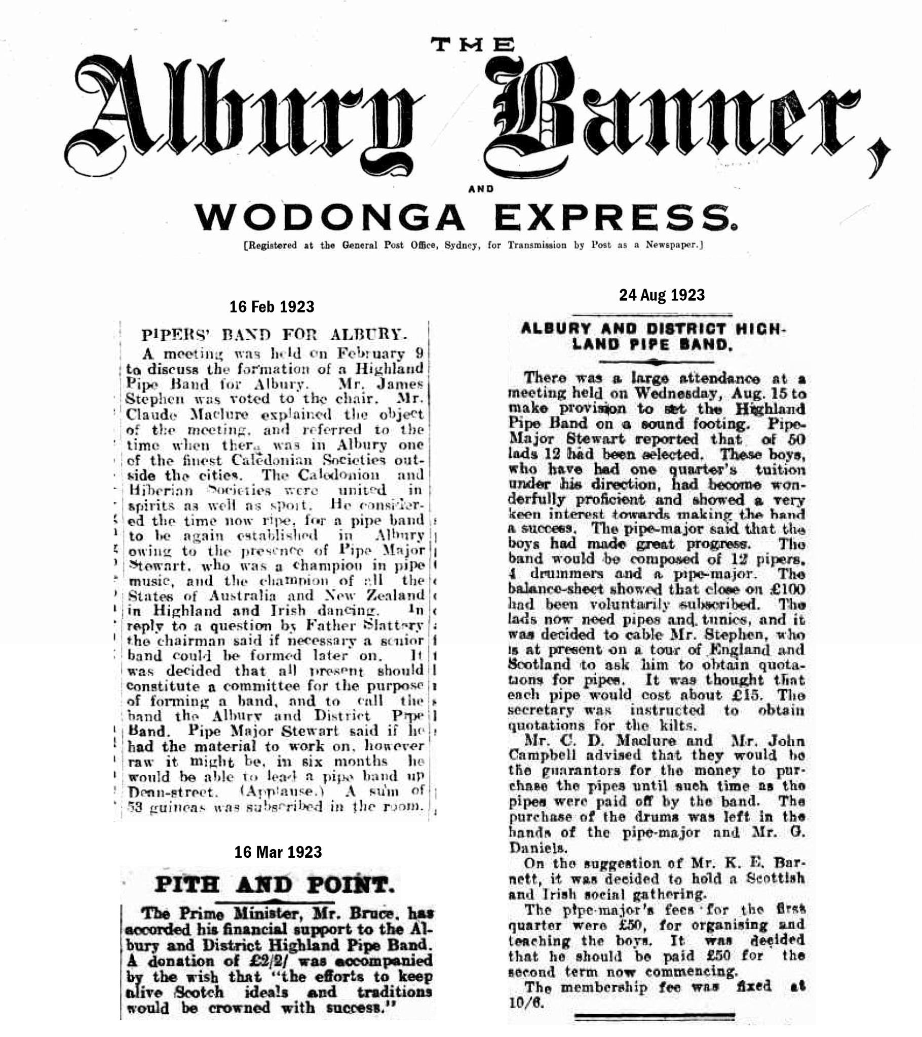 In February 1923 it was brought forth that Albury should form a Pipe Band. It was decided that the band be called the “Albury and District Pipe Band”, thus beginning a rich history of piping and drumming in the region.